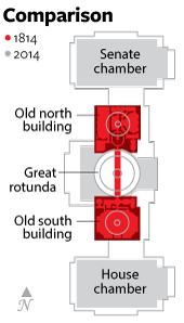 Once at the Capitol, the British split into two groups and entered from the east entrances. The building was still unfinished at the time; the iconic dome and rotunda had not yet been built. According to the architect of the Capitol, British soldiers focused on main rooms in the building, and spared the lobbies, hallways, and stairs they would need to escape.